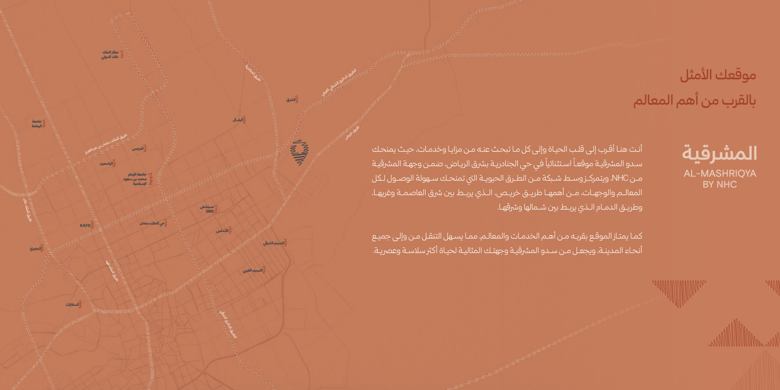في شرق الرياض، تمنحك فلل سدو المشرقية مفهوماً جديداً للحياة العصرية في وجهة المشرقية – إحدى أكبر وجهات – NHC والتي تقدم مزيجاً متكاملاًً من المرافق الترفيهية والخدمات التجارية والصحية والتعليمية، إلى جانب المساحات الخضراء والمراكز الرياضية والاجتماعية، مما يجعلها الوجهة المثالية للباحثين عن حياة مفعمة بالجمال والحداثة.